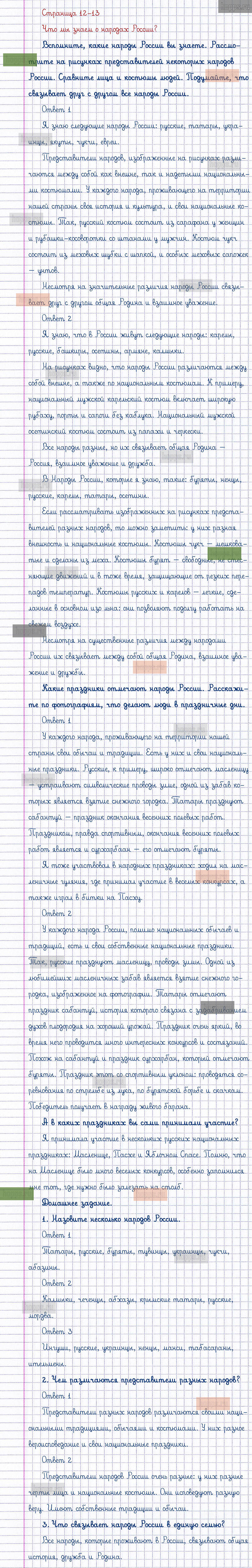 Подробные ответы к заданиям, расположенным на 12-13 странице 1 части учебника по окружающему миру автора Плешаков А.А. для учащихся 1 класса. Что мы знаем о народах России?