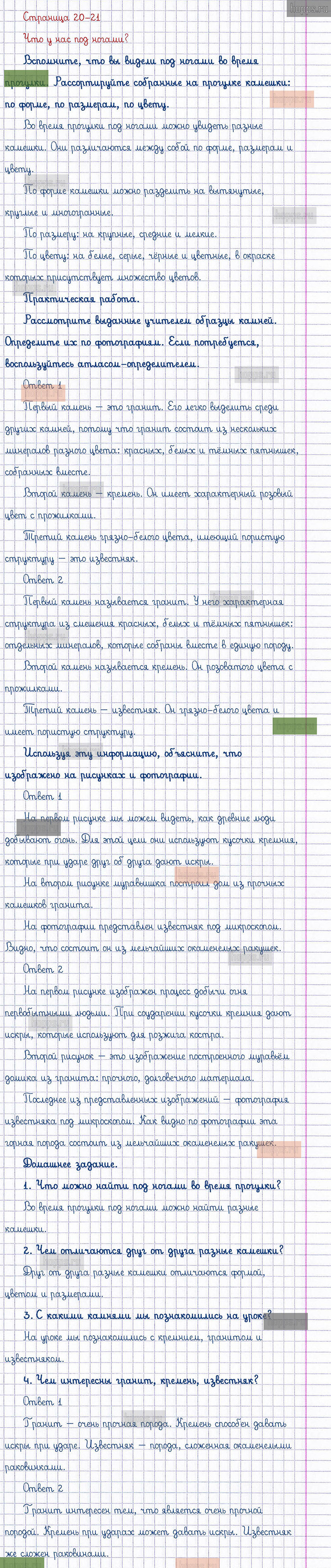 Подробные ответы к заданиям, расположенным на 20-21 странице 1 части учебника по окружающему миру автора Плешаков А.А. для учащихся 1 класса. Что у нас под ногами?