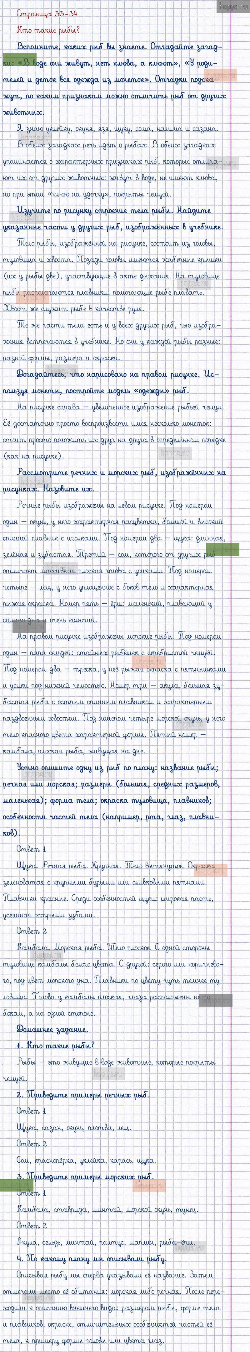 Подробные ответы к заданиям, расположенным на 33-34 странице 1 части учебника по окружающему миру автора Плешаков А.А. для учащихся 1 класса. Кто такие рыбы?