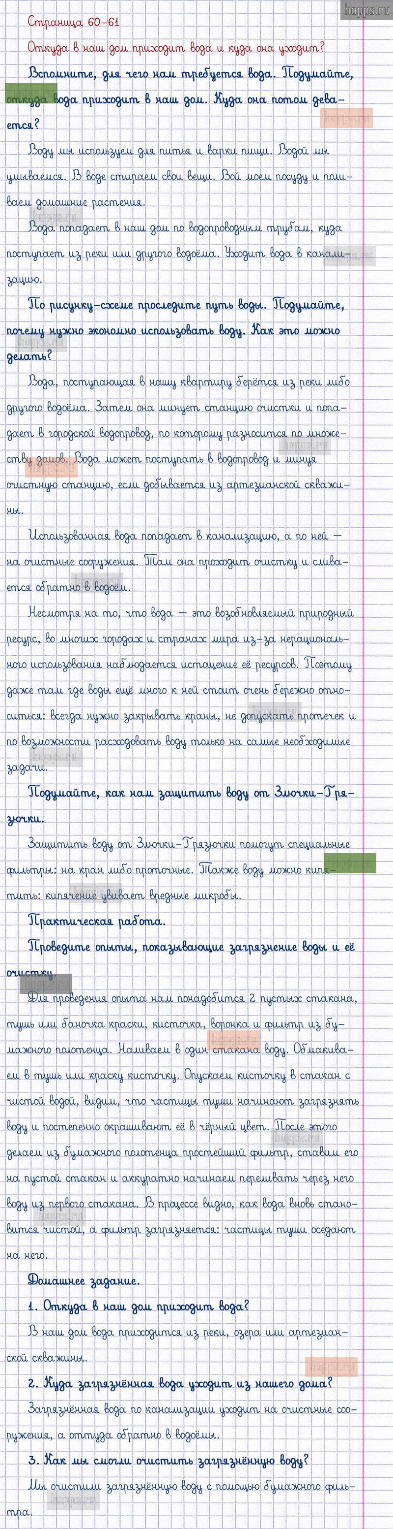 Подробные ответы к заданиям, расположенным на 60-61 странице 1 части учебника по окружающему миру автора Плешаков А.А. для учащихся 1 класса. Откуда в наш дом приходит вода и куда она уходит?