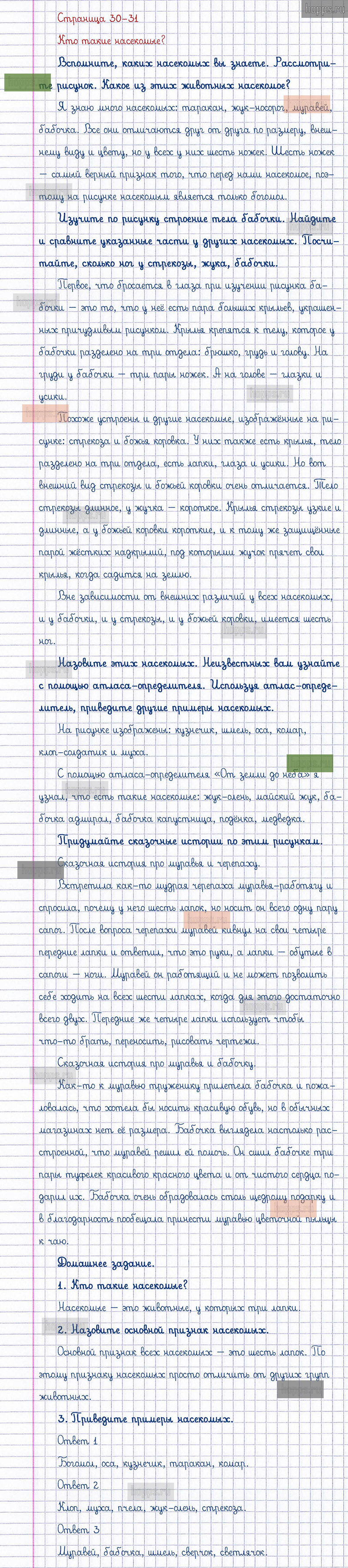 Подробные ответы к заданиям, расположенным на 30-31 странице 1 части учебника по окружающему миру автора Плешаков А.А. для учащихся 1 класса. Кто такие насекомые?
