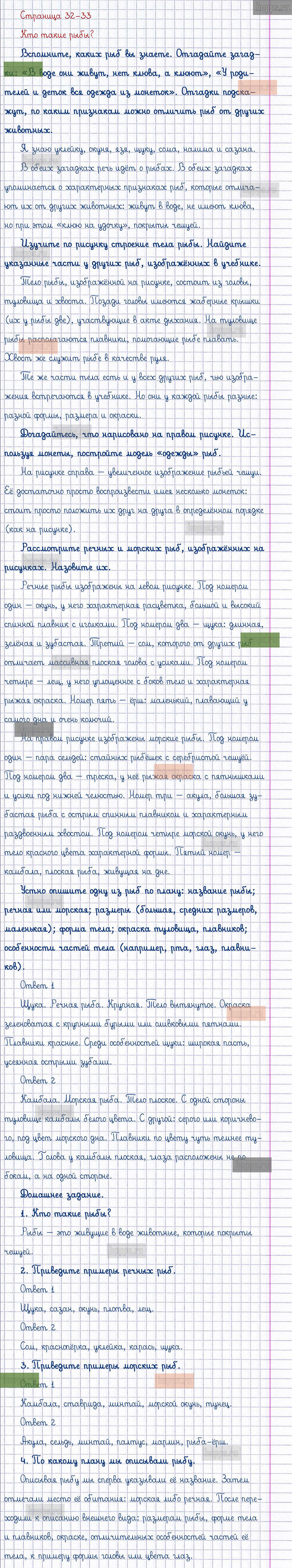 Подробные ответы к заданиям, расположенным на 32-33 странице 1 части учебника по окружающему миру автора Плешаков А.А. для учащихся 1 класса. Кто такие рыбы?