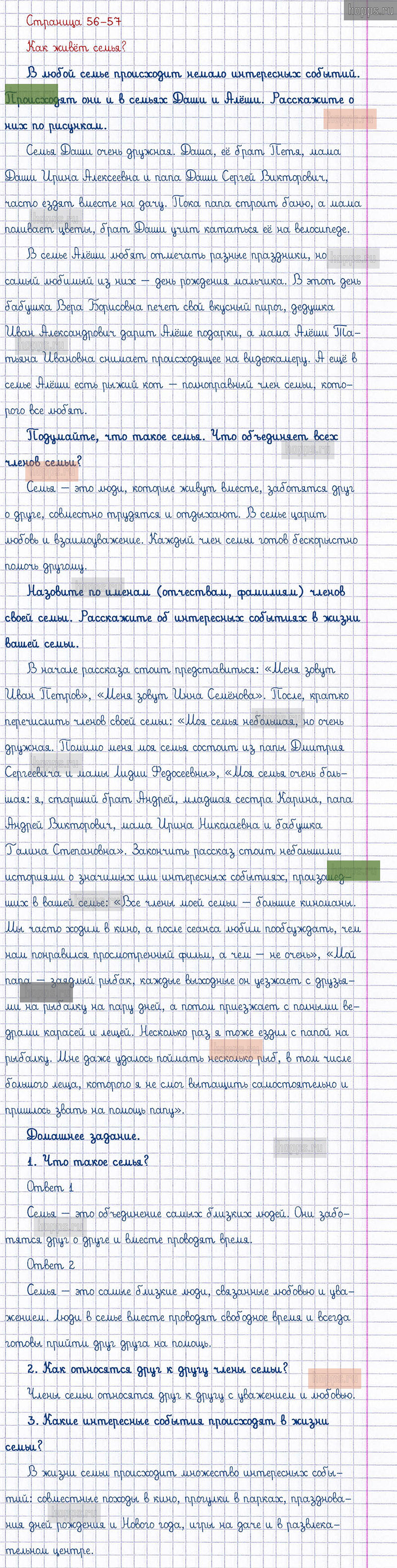Подробные ответы к заданиям, расположенным на 56-57 странице 1 части учебника по окружающему миру автора Плешаков А.А. для учащихся 1 класса. Как живёт семья?