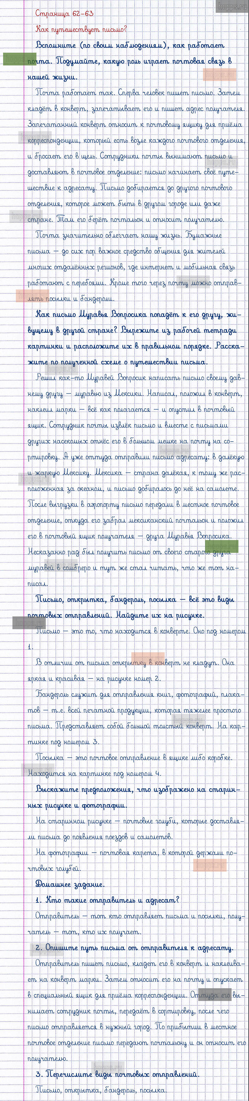Подробные ответы к заданиям, расположенным на 62-63 странице 1 части учебника по окружающему миру автора Плешаков А.А. для учащихся 1 класса. Как путешествует письмо?