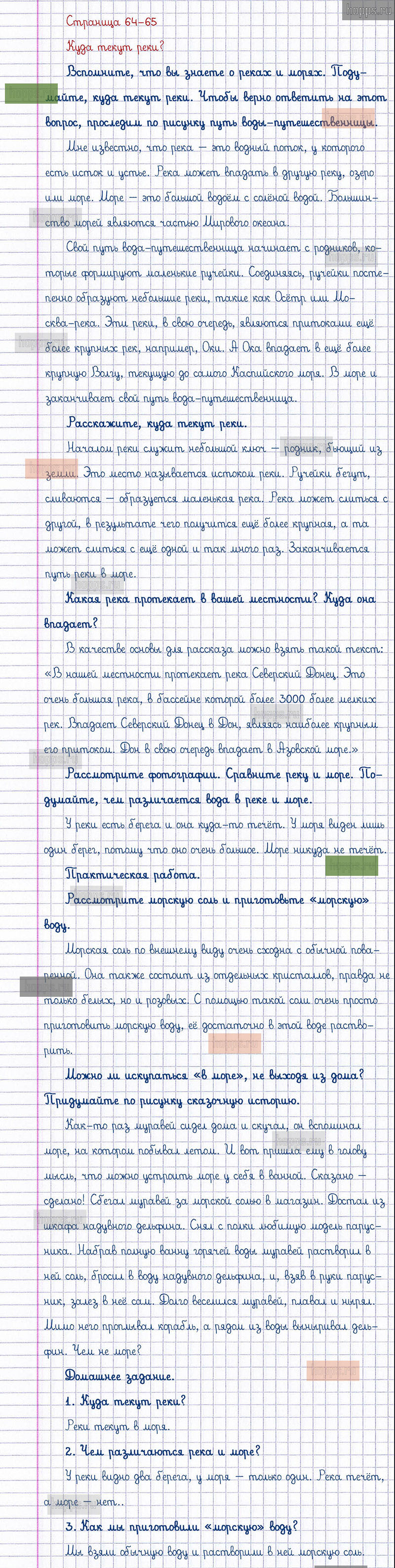 Подробные ответы к заданиям, расположенным на 64-65 странице 1 части учебника по окружающему миру автора Плешаков А.А. для учащихся 1 класса. Куда текут реки?