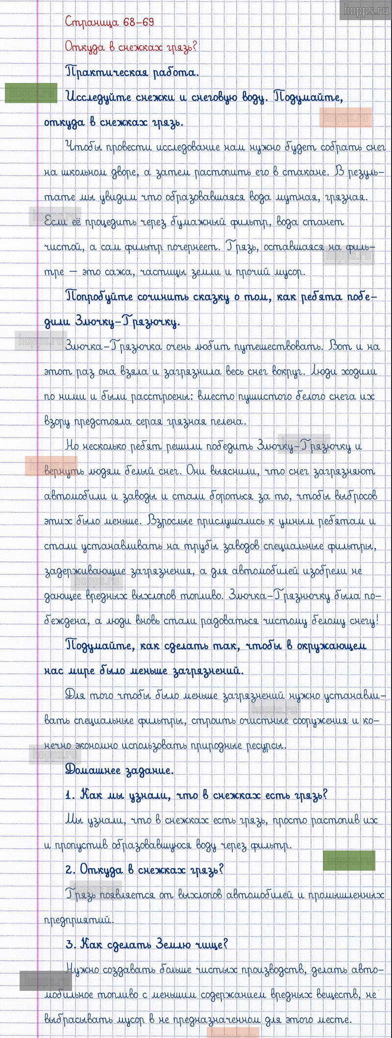 Подробные ответы к заданиям, расположенным на 68-69 странице 1 части учебника по окружающему миру автора Плешаков А.А. для учащихся 1 класса. Откуда в снежках грязь?