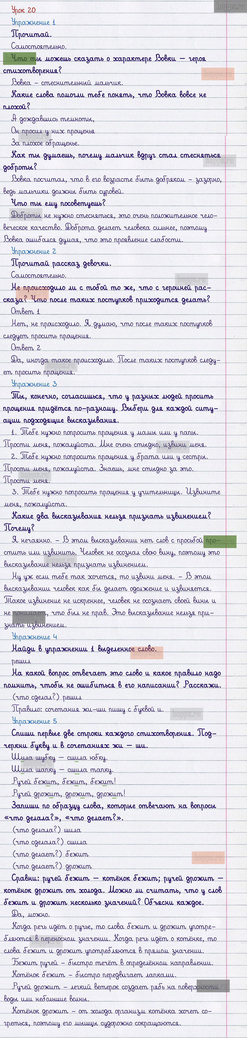 Подробные ответы к заданиям 20 урока учебника по русскому языку авторов С.В. Иванов, А.О. Евдокимова, М.И. Кузнецова, для учащихся 1 класса.