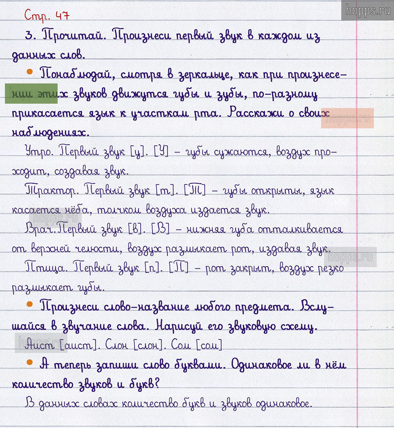 Подробные ответы к вопросам и заданиям, расположенным на 47 странице учебника по русскому языку авторов В.П. Канакина, В.Г. Горецкий для учащихся 1 класса.