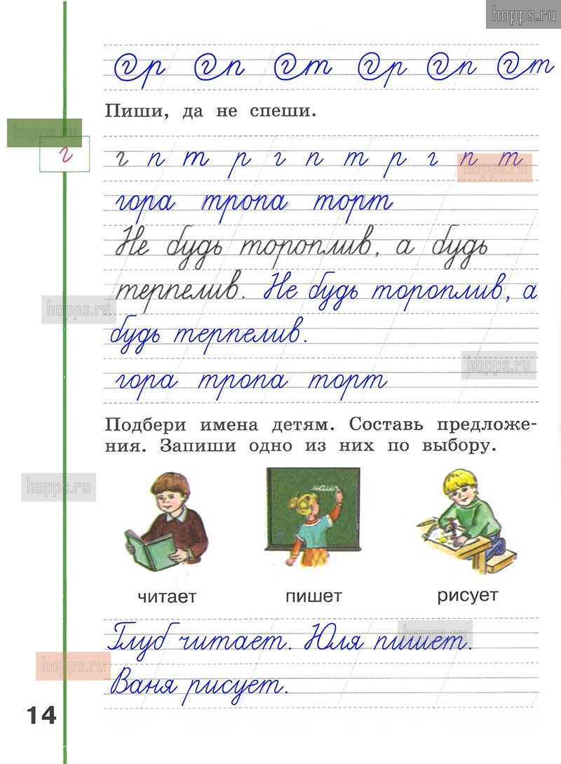 Подробные ответы к заданиям, расположенным на 14 странице рабочей тетради по русскому языку авторов Л.Ф. Климанова, А.В. Абрамов для учащихся 1 класса.