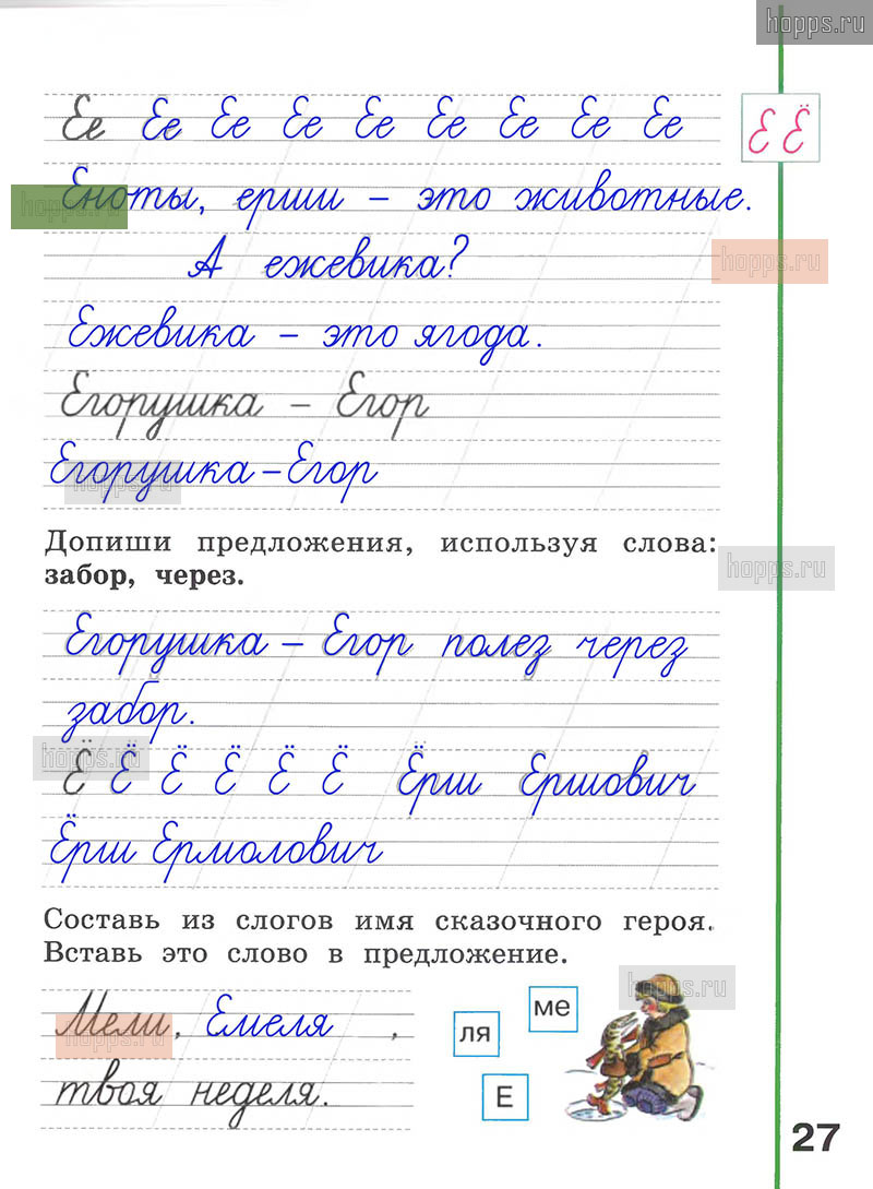 Подробные ответы к заданиям, расположенным на 27 странице рабочей тетради по русскому языку авторов Л.Ф. Климанова, А.В. Абрамов для учащихся 1 класса.