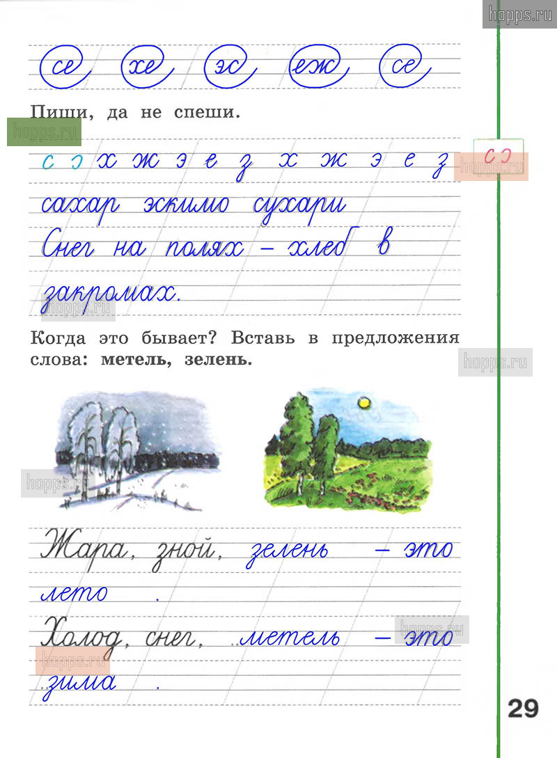 Подробные ответы к заданиям, расположенным на 29 странице рабочей тетради по русскому языку авторов Л.Ф. Климанова, А.В. Абрамов для учащихся 1 класса.
