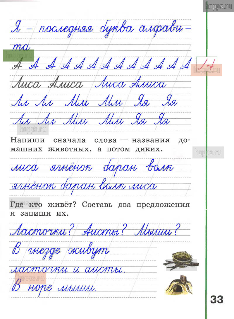 Подробные ответы к заданиям, расположенным на 33 странице рабочей тетради по русскому языку авторов Л.Ф. Климанова, А.В. Абрамов для учащихся 1 класса.