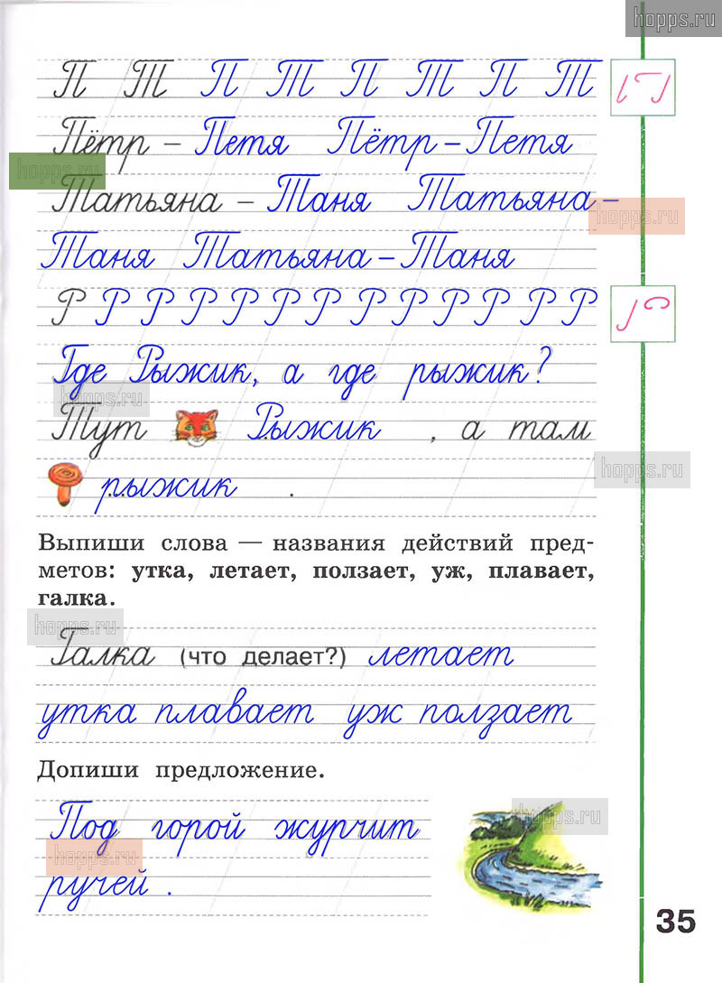 Подробные ответы к заданиям, расположенным на 35 странице рабочей тетради по русскому языку авторов Л.Ф. Климанова, А.В. Абрамов для учащихся 1 класса.