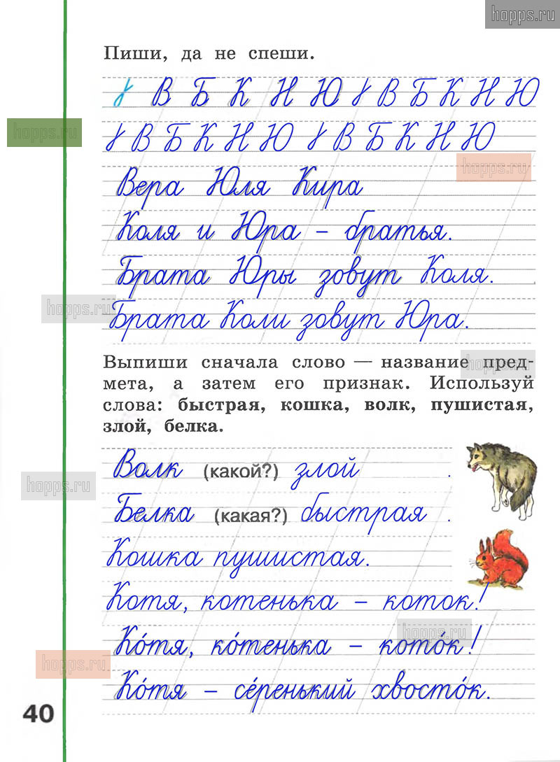 Подробные ответы к заданиям, расположенным на 40 странице рабочей тетради по русскому языку авторов Л.Ф. Климанова, А.В. Абрамов для учащихся 1 класса.
