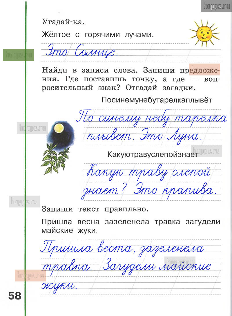 Подробные ответы к заданиям, расположенным на 58 странице рабочей тетради по русскому языку авторов Л.Ф. Климанова, А.В. Абрамов для учащихся 1 класса.