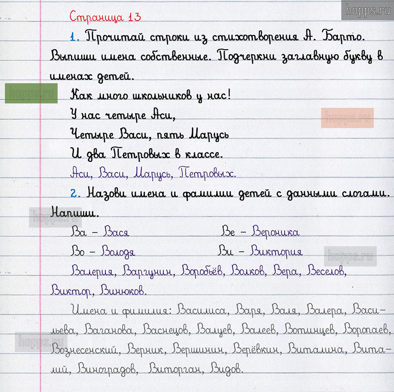 Подробные ответы к вопросам и заданиям, расположенным на 13 странице рабочей тетради по русскому языку авторов Л.Ф. Климанова, Т.В. Бабушкина для учащихся 1 класса.