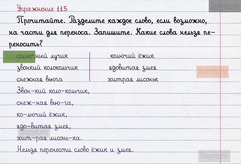 Подробные ответы к 115 упражнению учебника по русскому языку авторов Л.Ф. Климанова, С.Г. Макеева для учащихся 1 класса. Перенос слов.