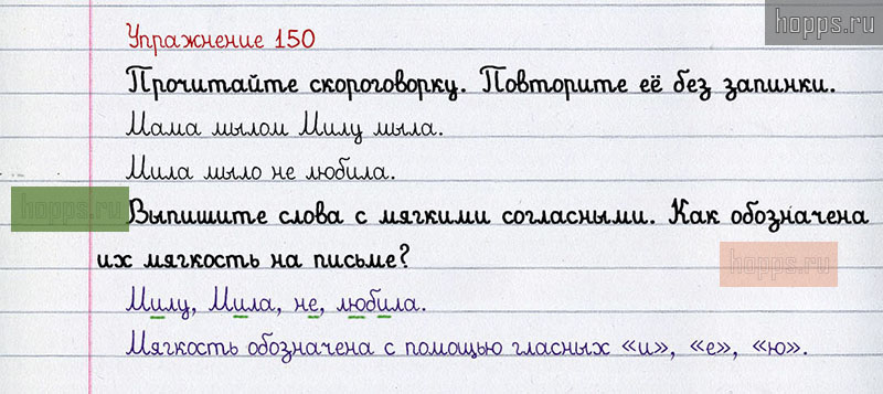 Подробные ответы к 150 упражнению учебника по русскому языку авторов Л.Ф. Климанова, С.Г. Макеева для учащихся 1 класса. Твёрдые и мягкие согласные звуки. Обозначение мягкости согласных звуков на письме.