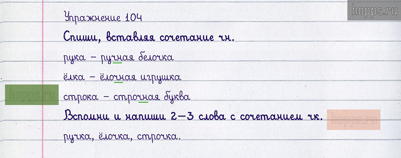 Подробные ответы к 104 упражнению учебника 2020 года по русскому языку автора Т.Г. Рамзаева для учащихся 1 класса. Сочетания чк, чн.