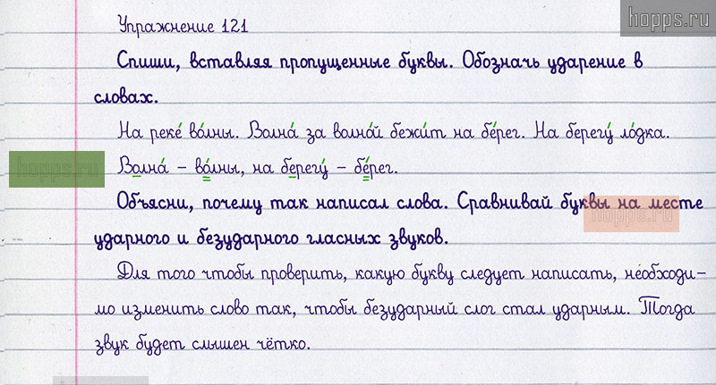Подробные ответы к 121 упражнению учебника 2020 года по русскому языку автора Т.Г. Рамзаева для учащихся 1 класса. Гласные звуки в ударном и безударном слогах и их обозначение на письме.