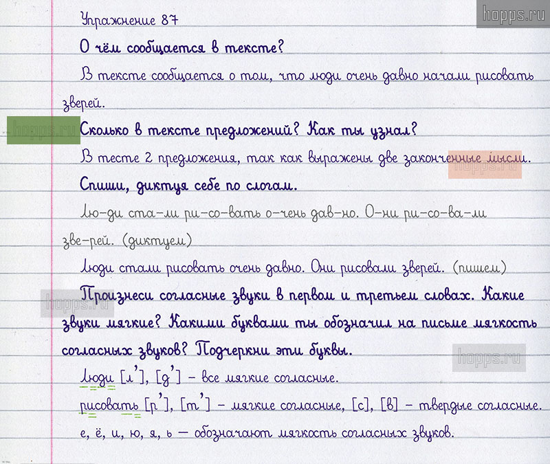 Подробные ответы к 87 упражнению учебника 2008 года по русскому языку автора Т.Г. Рамзаева для учащихся 1 класса. Обозначение мягкости согласных звуков на письме.