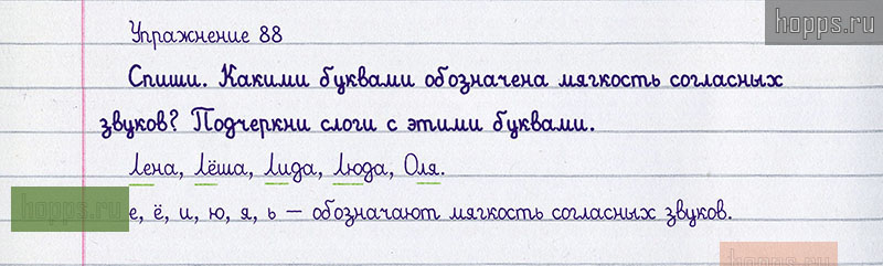 Подробные ответы к 88 упражнению учебника 2008 года по русскому языку автора Т.Г. Рамзаева для учащихся 1 класса. Обозначение мягкости согласных звуков на письме.