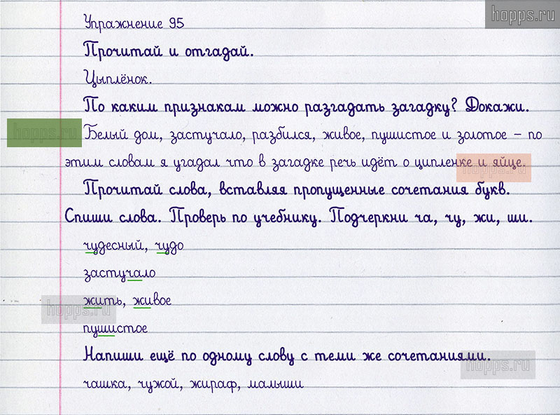 Подробные ответы к 95 упражнению учебника 2020 года по русскому языку автора Т.Г. Рамзаева для учащихся 1 класса. Шипящие согласные звуки. Буквы после шипящих в сочетаниях жи, ши, ча, ща, чу, щу.