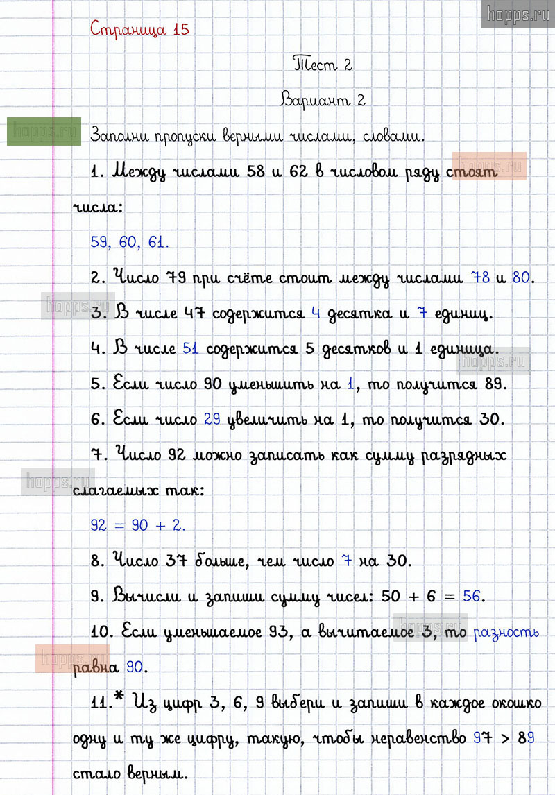 Подробные ответы к заданиям, расположенным на 15 странице проверочных работ по математике авторов С.И. Волкова для учащихся 2 класса. Нумерация. Тест 2, вариант 2.