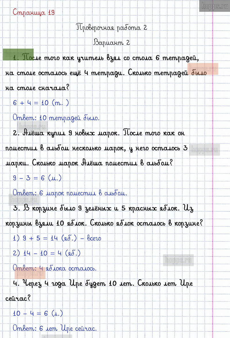 Подробные ответы к заданиям, расположенным на 19 странице проверочных работ по математике авторов С.И. Волкова для учащихся 2 класса. Сложение и вычитание. Проверочная работа 2, вариант 2.