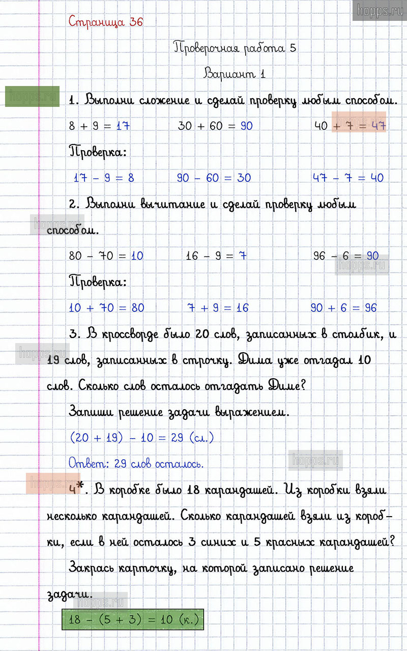 Подробные ответы к заданиям, расположенным на 36 странице проверочных работ по математике авторов С.И. Волкова для учащихся 2 класса. Сложение и вычитание. Проверочная работа 5, вариант 1.