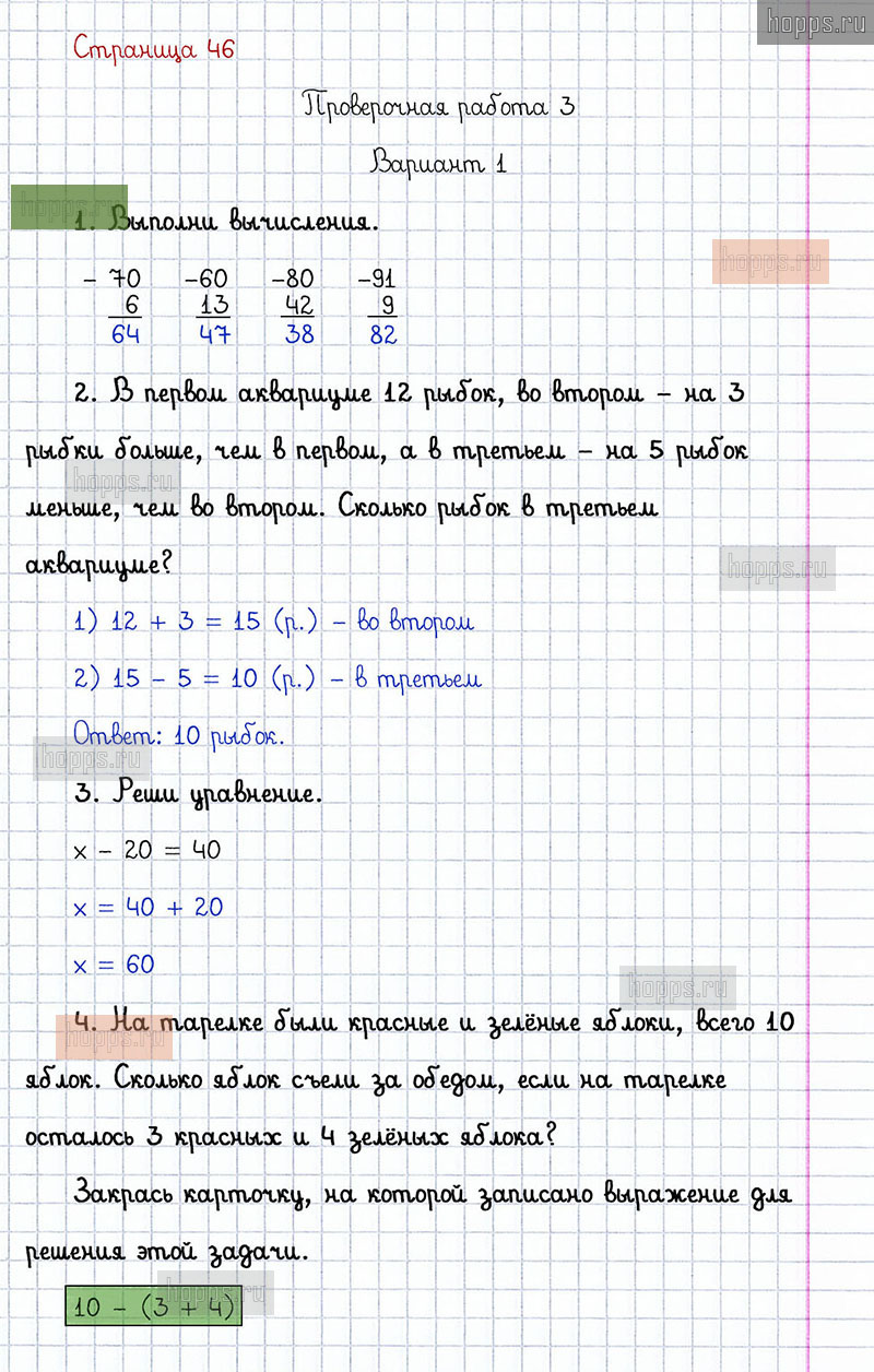 Подробные ответы к заданиям, расположенным на 46 странице проверочных работ по математике авторов С.И. Волкова для учащихся 2 класса. Сложение и вычитание. Проверочная работа 3, вариант 1.