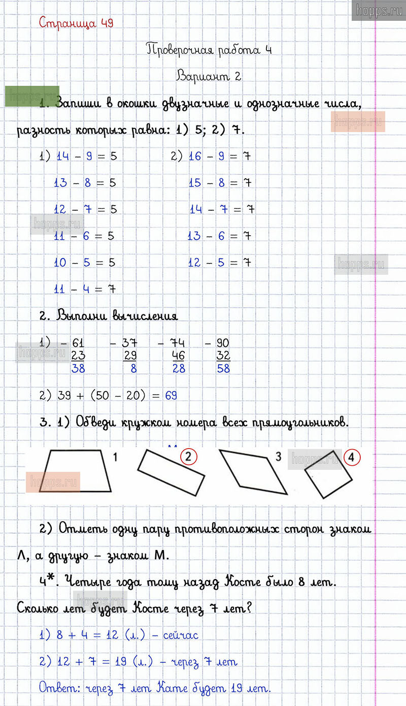 Подробные ответы к заданиям, расположенным на 49 странице проверочных работ по математике авторов С.И. Волкова для учащихся 2 класса. Сложение и вычитание. Проверочная работа 4, вариант 2.