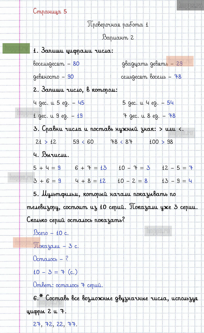 Подробные ответы к заданиям, расположенным на 5 странице проверочных работ по математике авторов С.И. Волкова для учащихся 2 класса. Нумерация. Проверочная работа 1, вариант 2.