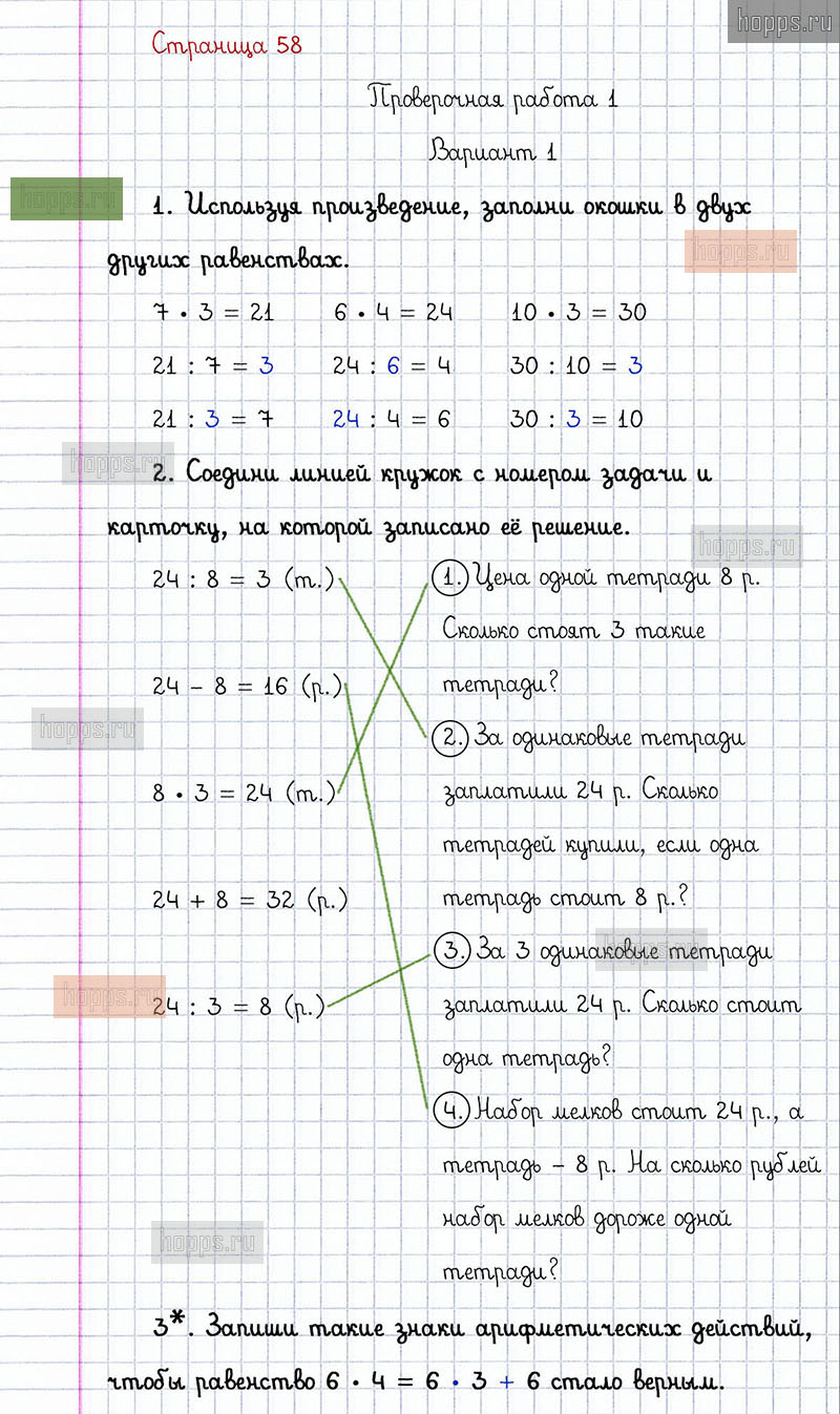 Подробные ответы к заданиям, расположенным на 58 странице проверочных работ по математике авторов С.И. Волкова для учащихся 2 класса. Умножение и деление. Проверочная работа 1, вариант 1.