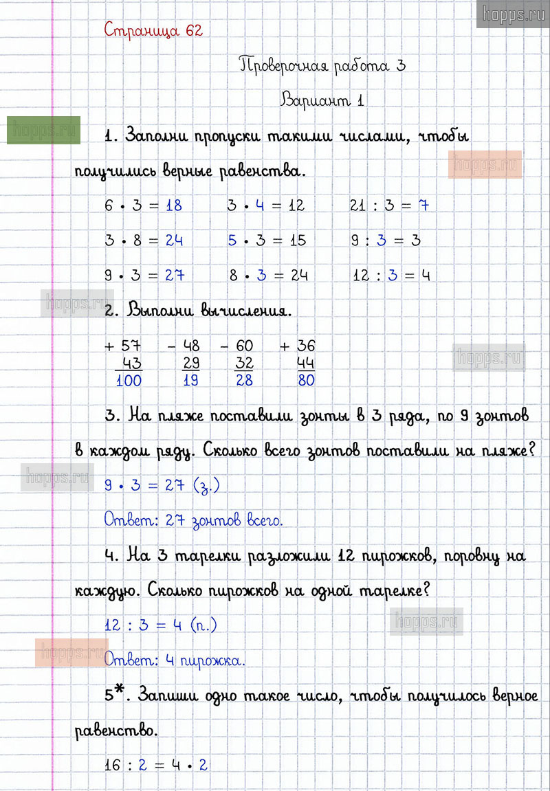 Подробные ответы к заданиям, расположенным на 62 странице проверочных работ по математике авторов С.И. Волкова для учащихся 2 класса. Умножение и деление. Проверочная работа 3, вариант 1.