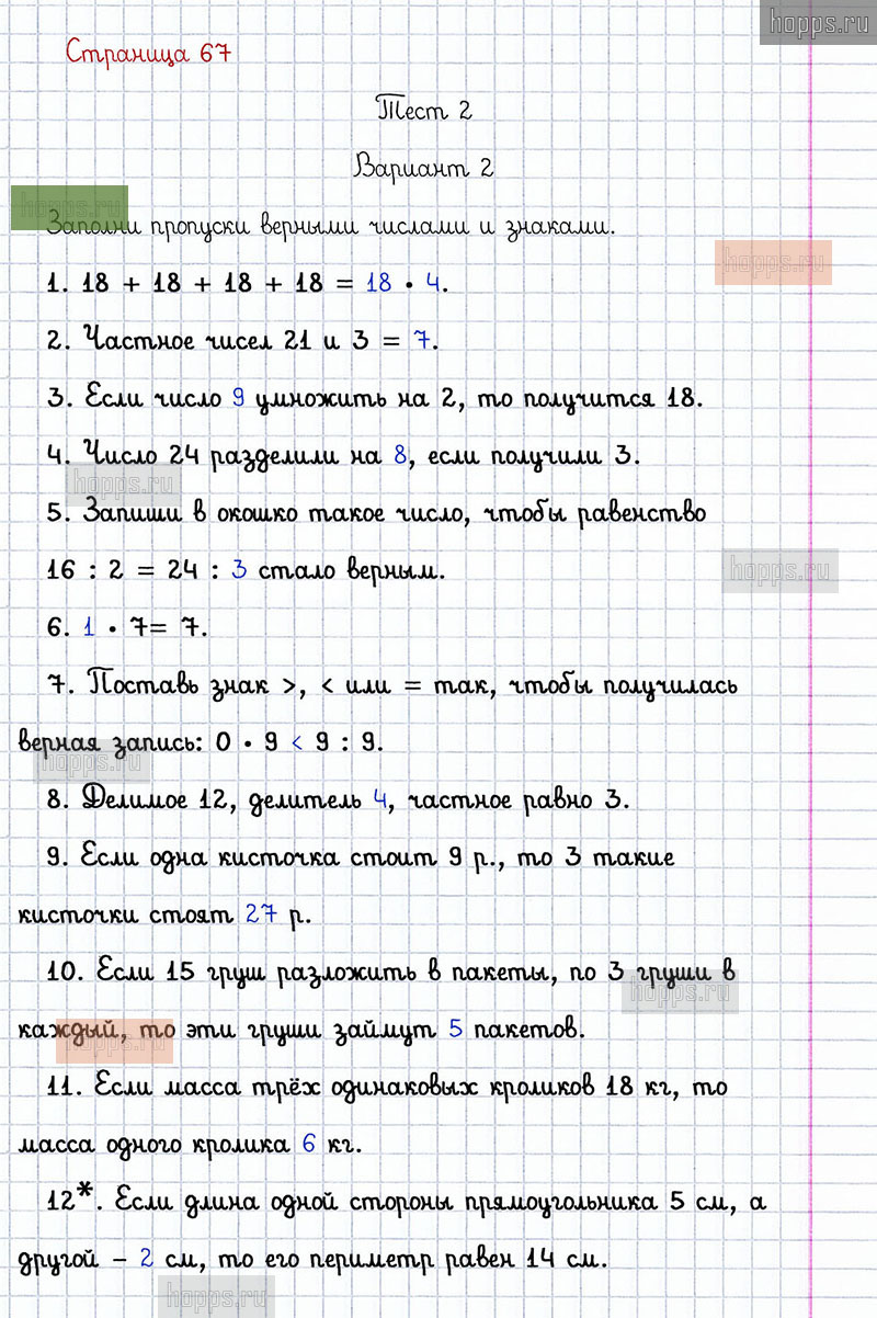 Подробные ответы к заданиям, расположенным на 67 странице проверочных работ по математике авторов С.И. Волкова для учащихся 2 класса. Умножение и деление. Тест 2, вариант 2.