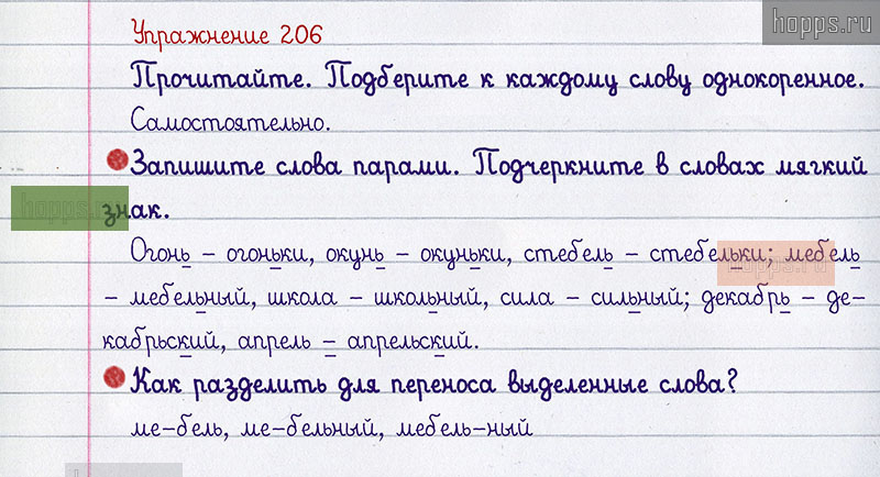 Подробные ответы к 206 упражнению 1 части учебника по русскому языку авторов В.П. Канакина, В.Г. Горецкий для учащихся 2 класса. Мягкий знак (Ь).