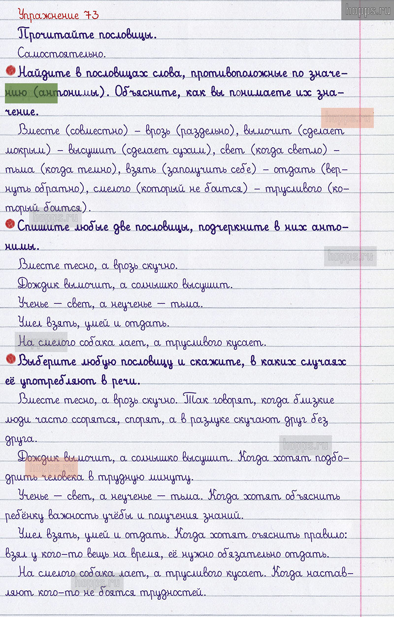 Подробные ответы к 73 упражнению 1 части учебника по русскому языку авторов В.П. Канакина, В.Г. Горецкий для учащихся 2 класса. Синонимы и антонимы.