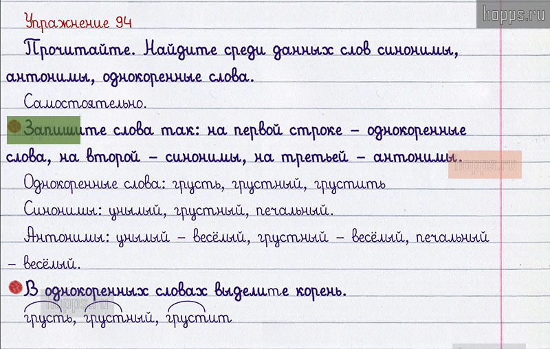 Подробные ответы к 94 упражнению 1 части учебника по русскому языку авторов В.П. Канакина, В.Г. Горецкий для учащихся 2 класса. Однокоренные слова.