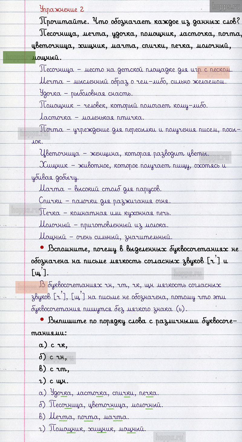 Подробные ответы к 2 упражнению 2 части учебника по русскому языку авторов В.П. Канакина, В.Г. Горецкий для учащихся 2 класса. Правописание буквосочетаний с шипящими звуками.