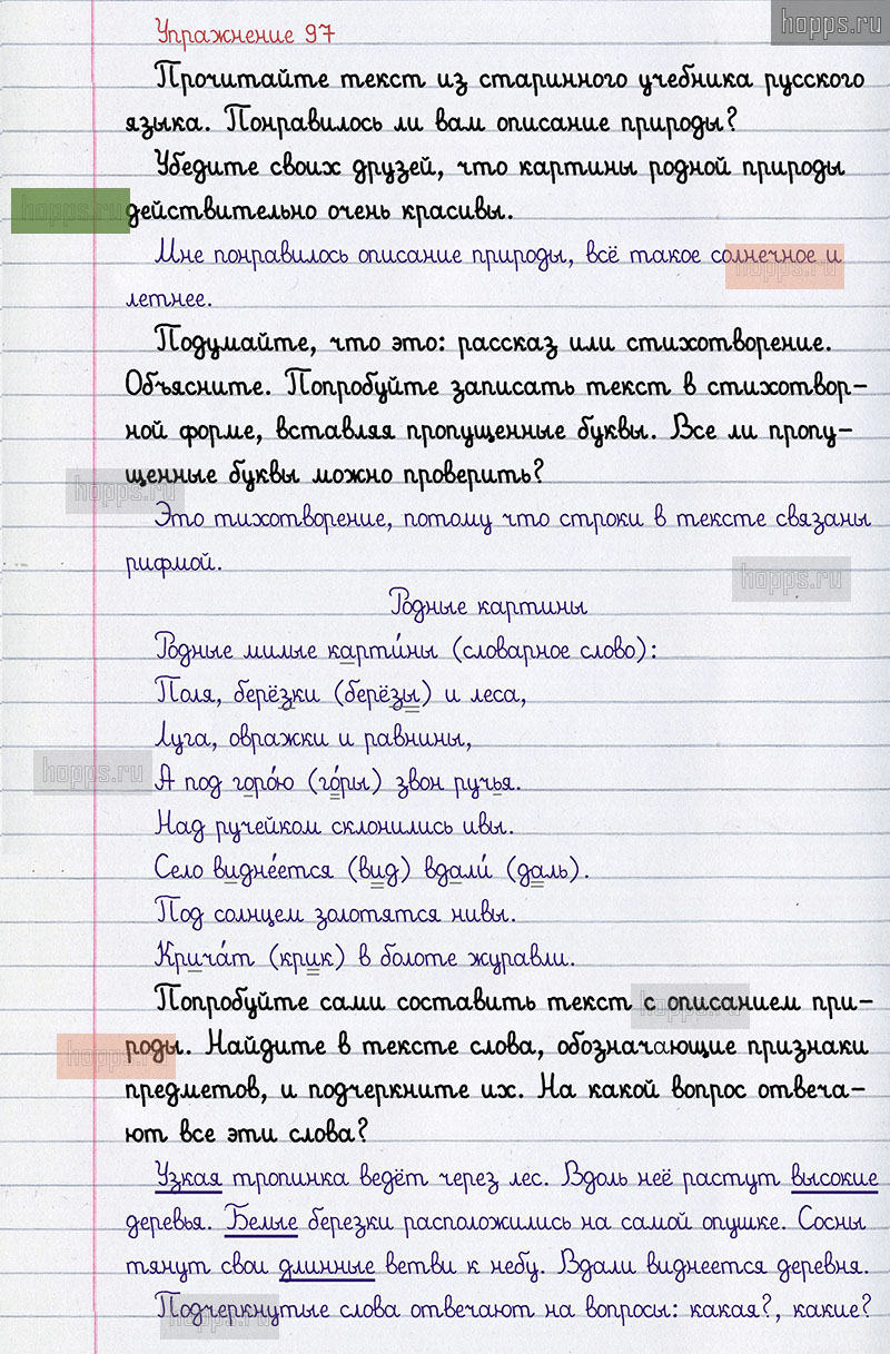 Подробные ответы к 97 упражнению 2 части учебника 2012 года по русскому языку авторов Л.Ф. Климанова, Т.В. Бабушкина для учащихся 2 класса.