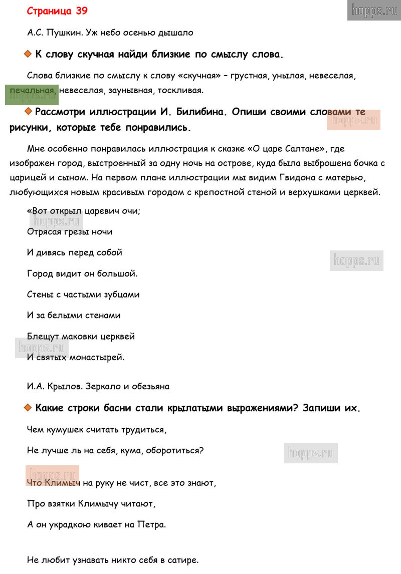 Готовые ответы к вопросам и заданиям на 39 странице рабочей тетради по литературному чтению для учащихся 3 класса, авторов М.В. Бойкина, Л.А. Виноградская, Школа России, 2019 г.