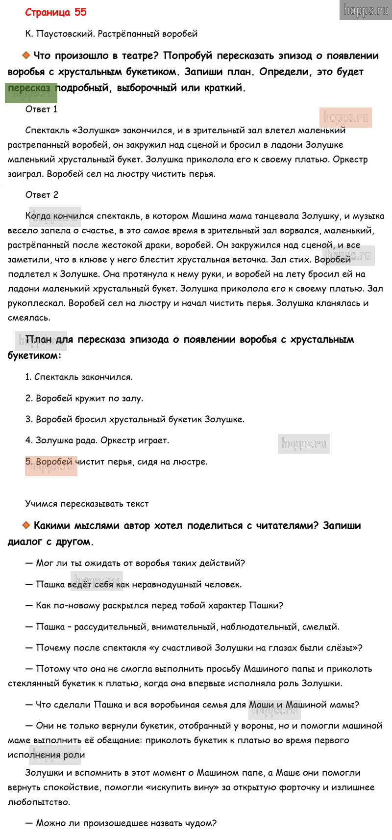 Готовые ответы к вопросам и заданиям на 55 странице рабочей тетради по литературному чтению для учащихся 3 класса, авторов М.В. Бойкина, Л.А. Виноградская, Школа России, 2019 г.