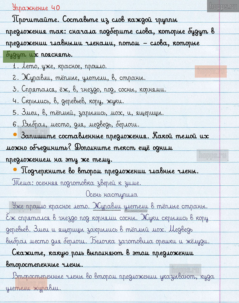 Подробные ответы к 40 упражнению 1 части учебника по русскому языку авторов В.П. Канакина, В.Г. Горецкий для учащихся 3 класса. Предложение.