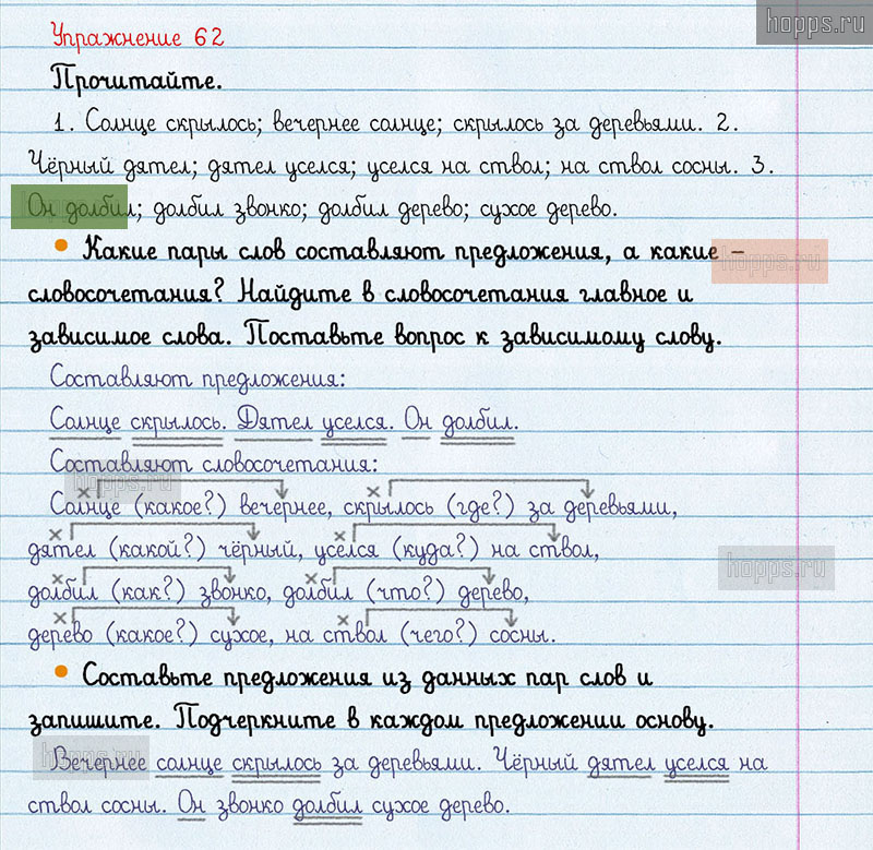 Подробные ответы к 62 упражнению 1 части учебника по русскому языку авторов В.П. Канакина, В.Г. Горецкий для учащихся 3 класса. Словосочетание.